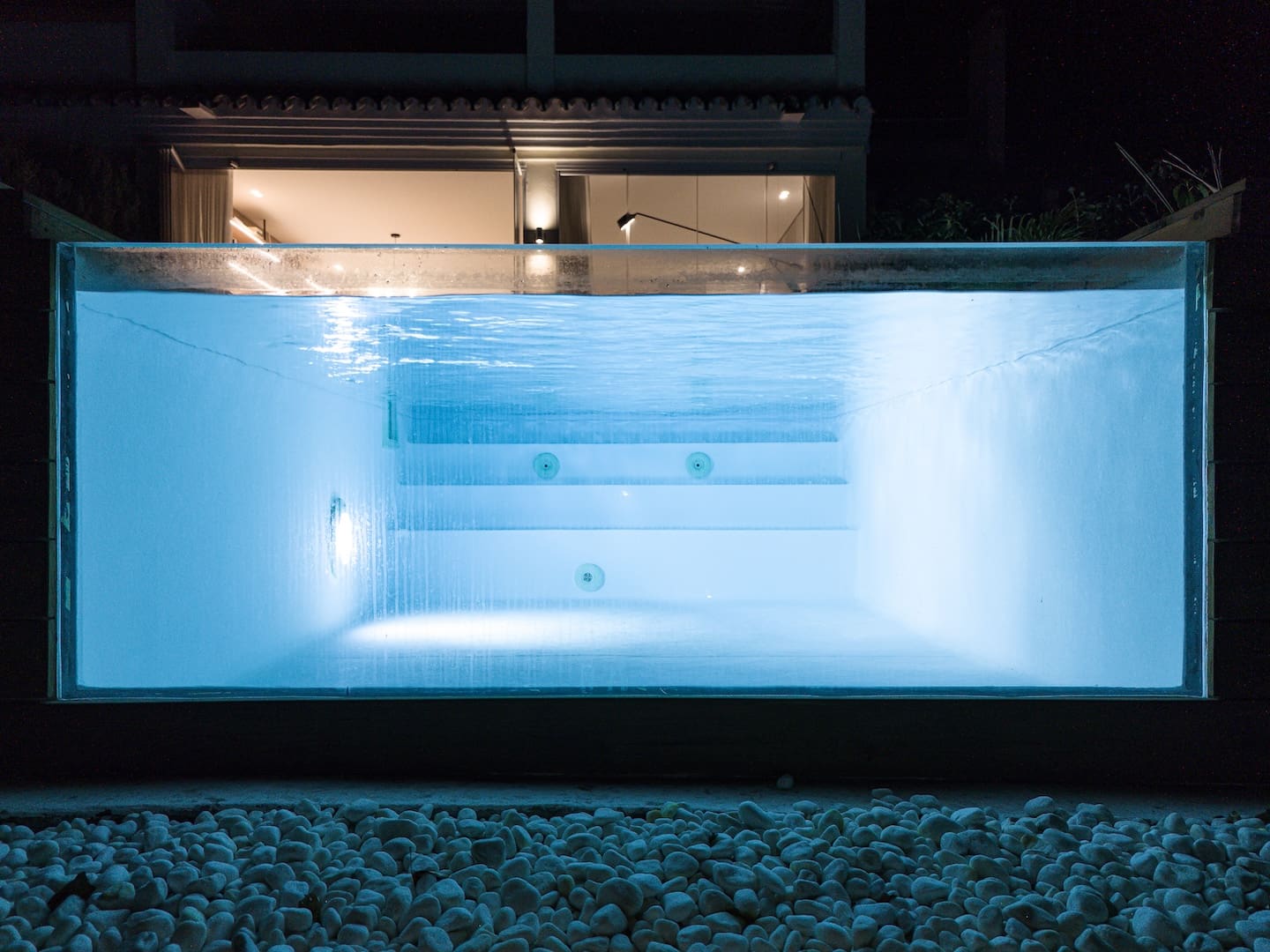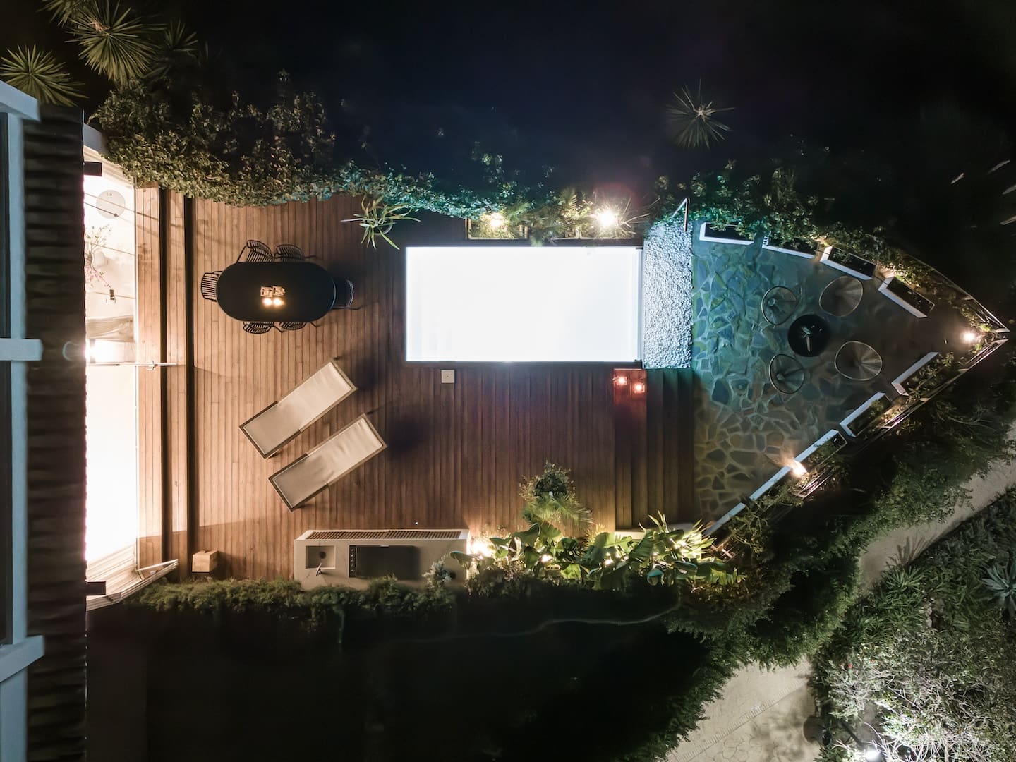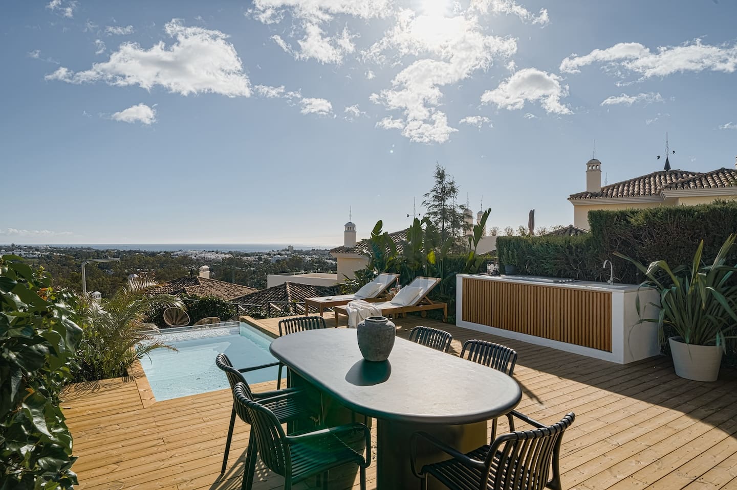 The home features an open plan modern living room, kitchen and dining room leading to a terrace with a private pool and lounge area. This space is perfect for both indoor and outdoor living, enjoying the sun and the view.
