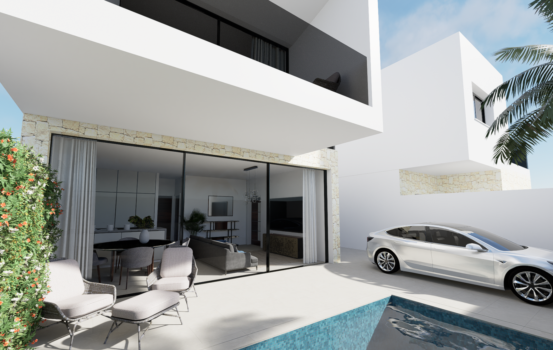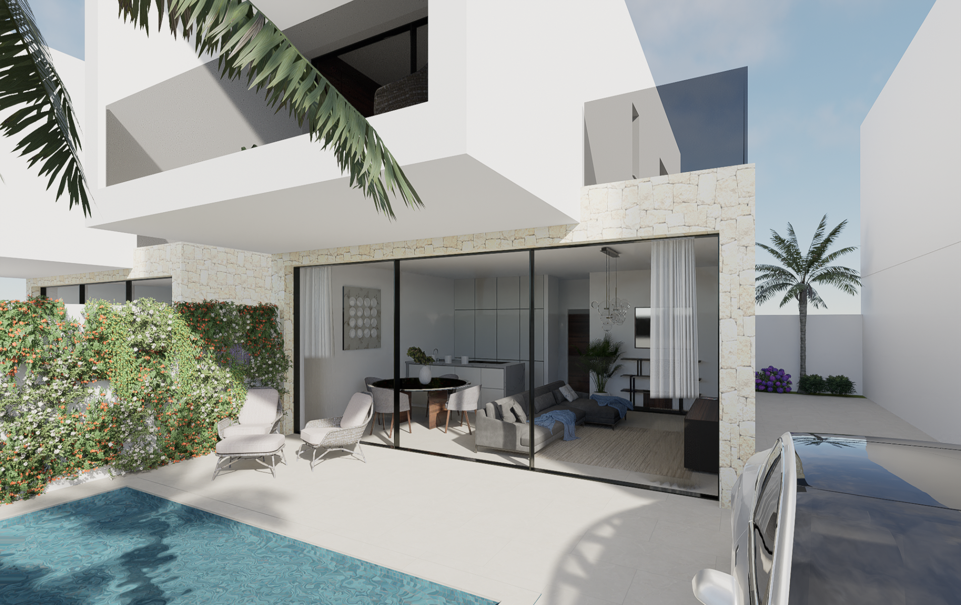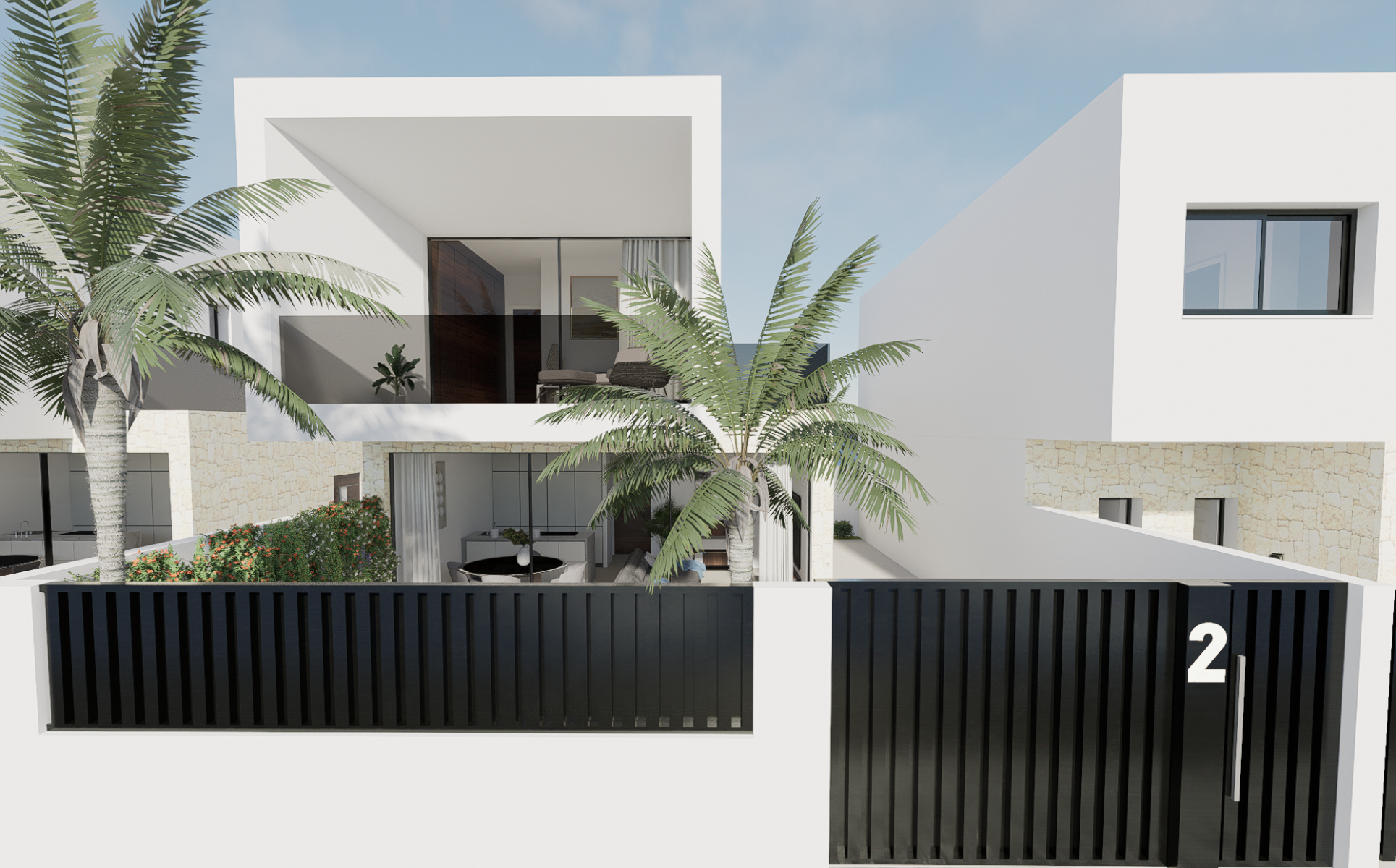 Moderne luxe villa´s met 3 slaapkamers en 3 badkamers gelegen op 3 km van de prachtige stranden van Lo Pagan . De villa´s hebben een woonkamer met moderne open keuken en schuiframen die aansluiten op de tuin en het privézwembad. Er is 1 slaapkamer met badkamer op de begane grond en op de eerste verdieping zijn er 2 slaapkamers met 2 badkamers met eigen terras. Er is een privéparkeerplaats op het perceel.