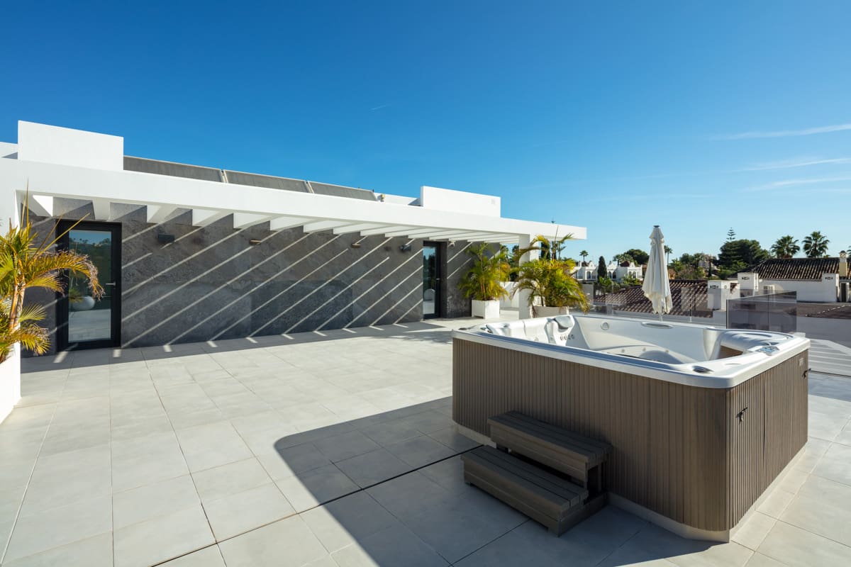 Experience the luxury of Villa Elegancia, a modern masterpiece in Nueva Andalucia. This renovated villa combines contemporary elegance with functional luxury and is situated in a prime location close to the renowned Aloha Golf Club in Golf Valley. With high-end health clinics, international schools and specialty stores within walking distance, this location offers the best of Marbella at your front door.